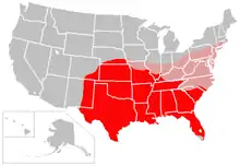 The nine-banded armadillo has been rapidly expanding its range both north and east within the United States, where it is the only regularly occurring species of armadillo. The armadillo crossed the Rio Grande from Mexico in the late 19th century, and was introduced in Florida at about the same time by humans. By 1995, the species had become well established in Texas, Oklahoma, Louisiana, Arkansas, Mississippi, Alabama, Georgia and Florida, and had been sighted as far afield as Kansas, Missouri, Tennessee, Kentucky, and South Carolina. A decade later, the armadillo had become established in all of those areas and continued its migration, being sighted as far north as southern Nebraska, southern Illinois, and southern Indiana.[11] The primary cause of this rapid expansion is explained simply by the species having few natural predators within the United States, little desire on the part of Americans to hunt or eat the armadillo, and the animals' high reproductive rate. The northern expansion of the armadillo is expected to continue until the species reaches as far north as Ohio, Pennsylvania, New Jersey and Connecticut, and all points southward on the East Coast of the United States. Further northward and westward expansion will probably be limited by the armadillo's poor tolerance of harsh winters, due to its lack of insulating fat and its inability to hibernate.[11] As of 2009, newspaper reports indicated the nine-banded armadillo seems to have expanded its range northward as far as Omaha, Nebraska in the west, and Kentucky Dam and Evansville, Indiana, in the east.[12][13][14] In 1995, armadillos were only seen in the southern tip of South Carolina, and within two to three years, they had swept across most of the state.[9] In late 2009, North Carolina began considering the establishment of a hunting season for armadillo, following reports that the species has been moving into the southern reaches of the state (roughly between the areas of Charlotte and Wilmington).[15][16] Outside the United States, the nine-banded armadillo ranges southward through Central and South America into northern Argentina and Uruguay, where it is still expanding its range.[9]