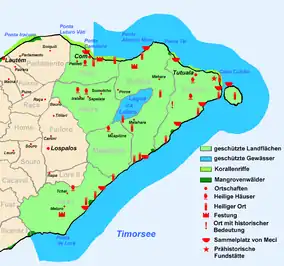 Part of the park first became a natural conservation reserve during the occupation of the country by Indonesia in the period from 1975–1999. When the country was under the United Nations (UN) Control as United Nations Transitional Administration in Timor Leste (UNTEAT), the same area was declared a “protected wild area” (but combined Tutuala beach and its adjoining forest) in 2000 under Regulation Number 2000/19. The cultural heritage of the five villages and the 15,000 people with their ancient ancestral heritage was made integral to the protected area.[2] It was designated as a Category V Landscape/Sea Scape under IUCN, which considers both nature and culture of the area as one unit for conservation and preservation, and which is akin to the criteria of Cultural Landscapes adopted for UNESCO World Heritage Sites.[4]