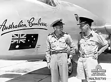 The flight received its first aircraft, the Canberra bomber A84-307, on 15 June 1953.[1] This aircraft had been built in Britain as the RAAF's first Canberra, and was flown to Australia by Wing Commander Cuming in July 1951. The journey had been completed in 21 hours and 41 minutes, setting an unofficial record for the route.[5] The flight's second aircraft, A84-201, arrived on 1 July.[1] This was the first Australian-built Canberra and was assigned to No. 1 Long Range Flight shortly after being completed. The second Australian-built Canberra, A84-202, was also assigned to the flight in August.[5] All three aircraft were modified for their specialised role by No. 1 Aircraft Depot. These modifications included fitting distance-measuring equipment in each of the aircraft and three fuel tanks in their bomb bays.[1][5] Wing Commander Cuming told journalists in August that the Australian-made Canberras were preferred to the British models on the grounds of national prestige and because the aircraft were fitted with superior navigation equipment.[6] A84-307 was retained by the flight, however, as the reserve aircraft to be used if modifications to A84-202 were not completed in time for the race.[5]