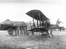 On 1 April, the Squadron relocated to the aerodrome at Auchel, operating alongside No. 18 Squadron and No. 27 Squadron.[9] From here the Squadron supported the British 1st Army near Fromelles and Souchez.[7] In June 1916, in preparation for the Somme Offensive, the Squadron had its ranked bolstered to 18 machines, 20 pilots and 18 observers. In the prelude to the battle, No. 25 Squadron flew reconnaissance and bombing missions behind enemy lines.[7] On 18 June, Cpl. James Henry Waller, and his pilot 2nd Lt. George Reynolds McCubbin, shot down famous German ace Max Immelmann. This occurred during No. 25 Squadron's second encounter with Immelmann that day, after he previously shot down Lt. C. E. Rogers for his 16th victory. Immelmann, flying a Fokker E.III, engaged No. 25 Squadron over Lens and subsequently shot down Lt. J. R. B. Savage before closing in on McCubbin's F.E.2b, whose gunner, Waller, opened fire and shot him down.[10] For their accomplishment, McCubbin was awarded the Distinguished Service Order while Waller was promoted to Sergeant and received the Distinguished Service Medal.[11] When the offensive started on 1 July, No. 25 Squadron started flying night time bombing missions. It started operating D.H.4 bombers in June 1917.[12]