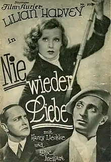 No More Love (German: Nie wieder Liebe) is a 1931 German musical comedy film directed by Anatole Litvak and starring Lilian Harvey, Harry Liedtke and Felix Bressart.[1] It is based on Julius Berstl's novel Dover-Calais. It was shot at the Babelsberg Studios in Berlin and on location along the French Riviera including Nice. The film's art direction was by Werner Schlichting. A separate French-language version Calais-Dover was also released.