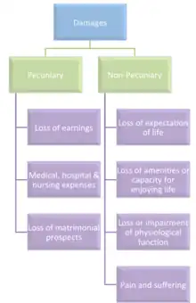 Non-economic damages caps are tort reforms to limit (i.e., "cap") damages in lawsuits for subjective, non-pecuniary harms such as pain, suffering, inconvenience, emotional distress, loss of society and companionship, loss of consortium, and loss of enjoyment of life.[1][2] This is opposed to economic damages, which encompasses pecuniary harms such as medical bills, lost wages, lost future income, loss of use of property, costs of repair or replacement, the economic value of domestic services, and loss of employment or business opportunities.[2][1] Non-economic damages should not be confused with punitive or exemplary damages, which are awarded purely to penalise defendants and do not aim to compensate either pecuniary or non-pecuniary losses.[1]