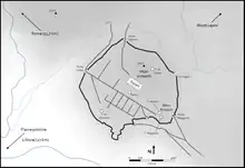 From excavations begun in 1901 it seems clear that the remains now visible on the site are entirely Roman.[4] The well-preserved walls are in the polygonal style, over 2.5 km in circuit, and are entirely embankment walls, not standing free above the internal ground level. The walls enclose an area of approximately 38 hectares. Remains of two towers, and of several gateways (notably the Porta Maggiore, defended by a tower), exist. The bastion at the Porta Maggiore still stands to 13 m. A square tower, referred to as "La Loggia" is also to be found along the curtain.[5][6]
