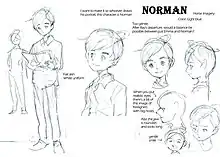 According to Kaiu Shirai, Norman is the mainstay of the group and had a "lighter" mood compare to Ray and Emma.[1][2] For his character design, Shirai asked for something like angelic, and a bit ethereal, with a simple design philosophy. Making him look like a moon or a knight of the story.[3] Posuka Demizu had difficulties creating the character design of Norman, including his body type, face and hair.[4] According to Demizu, Norman was supposed to be slender in his original design, but it was difficult to show the difference between him and the other children. All of them wear the same clothes, so she decided to maintain the current design.[3]