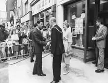 - Greeting Prince Charles in Deptford High Street on 18 July 1986, when Charles opened the Deptford Enterprise Agency.[13]