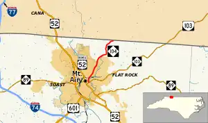 North Carolina Highway 104 (NC 104) is a primary state highway in the U.S. state of North Carolina. It connects northeast Surry County with downtown Mount Airy following Riverside Drive.