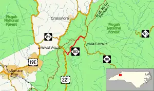 Where NC 183 begins, it is flanked by nearby McDowell and Avery counties. The highway also crosses briefly into McDowell county twice, in two short successions, in Linville Falls. Nearly halfway along the highway, a spur road from the Blue Ridge Parkway does a fly-over above the highway (no access).[1]