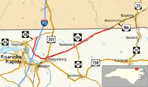 North Carolina Highway 186 (NC 186) is a primary state highway in the U.S. state of North Carolina. Entirely in Northampton County, it helps facilitate truck traffic parallel to I-95 and connects the communities of Seaboard and Margarettsville.