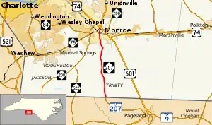 The second and current NC 207 was established in 1948 as a new primary route from the South Carolina state line to US 74/NC 151/NC 200 (Franklin Street) in Monroe. The highway is a continuation of SC 207, which predates it. Between 1958-62, NC 207 was truncated at Morrow Street; and then was extended to Church Street between 1969 and 1982.[2] On August 2011, NC 207 was extended along Skyway Drive to US 74/US 601/NC 200 (Roosevelt Boulevard), after NC 200 was relocated bypassing west of Monroe.[3]