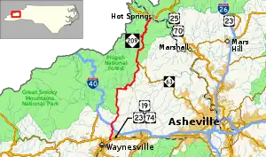 Established in 1921 as an original state route, it went from NC 10, in Lake Junaluska to NC 20, in Hot Springs.[3][4] In 1954, NC 209 was extended a .5-mile (0.80 km) south to its current southern terminus.