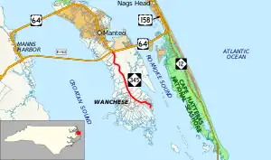 Around 1950, US 64/US 264 was routed onto Roanoke Island (ferry from Manns Harbor and bridge to Nags Head) with both sharing concurrency with NC 345 through Manteo.[5] In 1965, NC 345 was reduced by .33 miles (0.53 km) at the Fort Raleigh National Historic Site.[6] In 1967, US 64/US 264 replaced NC 345 through Manteo, pushing its northern terminus to its current location.[7] Also same year, NC 345 was rerouted in Wanchese, from going west to the Croatan Sound to east along the Mill Landing Creek area (originally NC 345A), ending at Thicket Lump Drive (SR 1141); its old alignment became Old Wharf Road (SR 1168).[8][9]