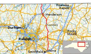 North Carolina Highway 39 (NC 39) is a primary state highway in the U.S. state of North Carolina. Traveling north–south, it connects the cities of Selma, Louisburg and Henderson, in the Research Triangle area.