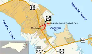 | 0.63 | 1.01 | Roanoke Island Festival Park | Eastern terminus; road continues into the park | ||