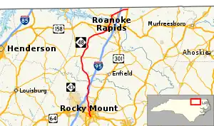 North Carolina Highway 48 (NC 48) is a primary state highway in the U.S. state of North Carolina that principally connects the cities of Rocky Mount and Roanoke Rapids. The route offers an alternative to US 301 and I-95.