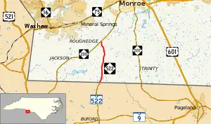 NC 522 is a short 5.84-mile (9.40 km) two-lane rural highway in Union County, passing through an area of mixed forest and farmland.[3]