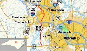 North Carolina Highway 751 (NC 751) is a northsouth state road in North Carolina that runs from U.S. Route 64 (US 64) near Jordan Lake State Recreation Area, to US 70 Business near Durham. The road also continues south approximately 4.3 miles (6.9 km) to US 1 as New Hill-Olive Chapel Road (SR 1141). It runs largely parallel to NC 55, extending farther west towards Hillsborough which can be reached by continuing on US 70.