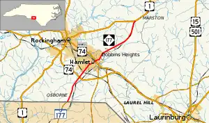 North Carolina Highway 177 (NC 177) is a 16-mile-long (26 km) route in the piedmont region of North Carolina. The road runs from South Carolina Highway 177 (SC 177) at the North Carolina-South Carolina border, through the town of Hamlet to U.S. Highway 1 (US 1) just south of Hoffman and just north of Rockingham. NC 177 was created in 1961 as a renumbering of NC 77.