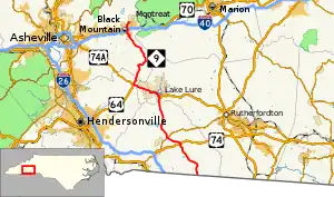 NC 9 is co-signed with US 64/74A in the city of Lake Lure. This is about 20 miles (32 km) north of the southern terminus.