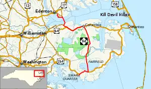 The route spans the Albemarle Sound at the 3.5-mile (5.6 km) Albemarle Sound Bridge, connecting Chowan and Washington Counties. It also crosses Lake Mattamuskeet at the Mattamuskeet National Wildlife Refuge. The highway passes through the following municipalities: