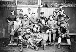 The University of North Carolina fielded its first football team in 1888.[6] The Tar Heels played four games with a final record of 1–3. The team captains for the 1888 season were Bob Bingham and Steve Bragaw.[6] The game against Wake Forest was the first in the state, and the first against Trinity the first "scientific" game in the state.[6] Ergo, one or the other is the first intercollegiate game in North Carolina. Between the first two games played in 1888 and next two games played in 1889 Princeton star Hector Cowan traveled south and trained the team.[7][8] At the beginning of 1889, UNC played two games with a final record of 1–1.[9] The team captains for the 1889 season were Lacy Little and Steve Bragaw.[6]