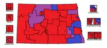 The North Dakota State House by district (as of 2016). Red is 2 Republicans, blue is 2 Democrats/NPL, and purple is one of each