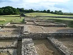 The architect Henry Hakewill excavated the ruins in 1813–16.[4][5] Professor Francis Haverfield conducted further excavations in 1910.[5] Aerial archaeology in 1943 photographed the previously unknown plan of the southwest wing.[6] Excavations for the Ministry of Public Building and Works in 1958 revealed several phases of occupation and development, starting with Iron Age postholes indicating that the first buildings on the site were wooden.[7] The ruins were further excavated in the 1970s.[5]