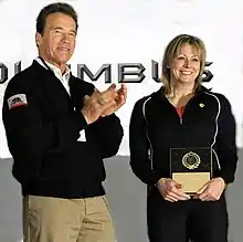 Northeast College alumnus Karyn Marshall became a chiropractor in addition to her weightlifting career; she was inducted into the USA Weightlifting Hall of Fame in 2011. Arnold Schwarzenegger (left) presented the award.