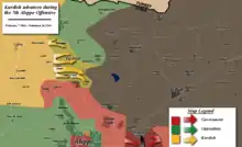 At the start of 7 February, government troops were seven kilometers from rebel-held Tell Rifaat.[96] They then advanced and captured the village of Kiffin, bringing them to within five kilometers of Tell Rifaat,[97] after which they proceeded to attack Kafr Naya from two different flanks.[35] Concurrently, the SDF seized three villages during the day,[97] including Ajar and its hill,[98][99] Maraanaz[69] and Deir Jamal.[69][100] During the SDF's advance on Deir Jamal, a local Mountain Hawks Brigade unit defected to the Army of Revolutionaries and handed over Deir Jamal to the SDF.[29] The SDF also took full control of the road south of Deir Jamal, preventing government forces from advancing on Tell Rifaat via this route.[101] The army and the SDF reportedly set up a joint checkpoint near Kiffin to avoid potential skirmishes.[8] Heavy Russian air-strikes continued against Menagh throughout the following night.[102]
