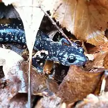 The northern slimy salamander is called "slimy" because it produces sticky slime from glands on its lower back and tail in order to defend itself from predators.[2] It is also sometimes referred to as the viscid salamander, grey-spotted salamander, slippery salamander, or sticky salamander, depending on which source is consulted.[3]