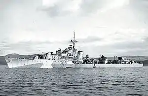 The destroyer HNoMS Stord played an integral role in the sinking of the German battleship Scharnhorst in the Battle of the North Cape. Shortly after Scharnhorst's engagement with HMS Duke of York, Stord and three other S-class destroyers were ordered to position themselves for a torpedo strike on the battleship. Along with HMS Scorpion, Stord fired eight torpedoes, four of which hit, incapacitating Scharnhorst and allowing the rest of the Allied fleet to catch up and sink it.[8] After the battle, the commanding officer of Duke of York said "... the Norwegian destroyer Stord carried out the most daring attack of the whole action..."[7]