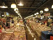 Noryangjin Fisheries Wholesale Market or shortly Noryangjin Fish Market (Hangul: 노량진 수산시장) is an extensive farmers fish market in the neighborhood of Noryangjin-dong in Dongjak-gu, Seoul, South Korea. It is located east of 63 Building, and just south of the Han River. Metro line One passes through at Noryangin station near-by. Exit the station at exit 1 and walk under the bridge.