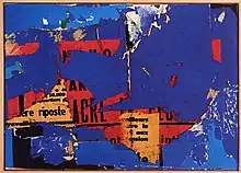 Nouveau réalisme (French for "new realism") is an artistic movement founded in 1960 by the art critic Pierre Restany[1] and the painter Yves Klein during the first collective exposition in the Apollinaire gallery in Milan. Pierre Restany wrote the original manifesto for the group, titled the "Constitutive Declaration of New Realism," in April 1960, proclaiming, "Nouveau Réalisme—new ways of perceiving the real."[2] This joint declaration was signed on 27 October 1960, in Yves Klein's workshop, by nine people: Yves Klein, Arman, Martial Raysse, Pierre Restany, Daniel Spoerri, Jean Tinguely and the Ultra-Lettrists, Francois Dufrêne, Raymond Hains, Jacques de la Villeglé; in 1961 these were joined by César, Mimmo Rotella, then Niki de Saint Phalle and Gérard Deschamps. The artist Christo showed with the group. It was dissolved in 1970.[2]