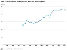 US nuclear reactors were originally licensed to operate for 40-year periods. In the 1980s, the NRC determined that there were no technical issues that would preclude longer service.[63] Over half of US nuclear reactors are over 30 years old and almost all are over twenty years old.[64] As of 2011, more than 60 reactors have received 20-year extensions to their licensed lifetimes.[65] The average capacity factor for all US reactors has improved from below 60% in the 1970s and 1980s, to 92% in 2007.[66][67]