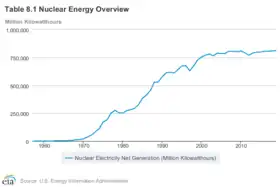 In the United States, nuclear power is provided by 92 commercial reactors with a net capacity of 94.7 gigawatts (GW), with 61 pressurized water reactors and 31 boiling water reactors.[1] In 2019, they produced a total of 809.41 terawatt-hours of electricity,[2] which accounted for 20% of the nation's total electric energy generation.[3] In 2018, nuclear comprised nearly 50 percent of US emission-free energy generation.[4][5]