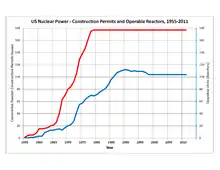 After the Three Mile Island accident, NRC-issued reactor construction permits, which had averaged more than 12 per year from 1967 through 1978, came to an abrupt halt; no permits were issued between 1979 and 2012 (in 2012, four planned new reactors received construction permits). Many permitted reactors were never built, or the projects were abandoned. Those that were completed after Three Mile island experienced a much longer time lag from construction permit to starting of operations. The Nuclear Regulatory Commission itself described its regulatory oversight of the long-delayed Seabrook Nuclear Power Plant as "a paradigm of fragmented and uncoordinated government decision making," and "a system strangling itself and the economy in red tape."[68] The number of operating power reactors in the US peaked at 112 in 1991, far fewer than the 177 that received construction permits. By 1998 the number of working reactors declined to 104, where it remains as of 2013. The loss of electrical generation from the eight fewer reactors since 1991 has been offset by power uprates of generating capacity at existing reactors.[69]