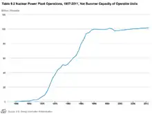 Despite the problems following Three Mile Island, output of nuclear-generated electricity in the US grew steadily, more than tripling over the next three decades: from 255 billion kilowatt-hours in 1979 (the year of the Three Mile Island accident), to 806 billion kilowatt-hours in 2007.[70] Part of the increase was due to the greater number of operating reactors, which increased by 51%: from 69 reactors in 1979, to 104 in 2007. Another cause was a large increase in the capacity factor over that period. In 1978, nuclear power plants generated electricity at only 64% of their rated output capacity. Performance suffered even further during and after Three Mile Island, as a series of new safety regulations from 1979 through the mid-1980s forced operators to repeatedly shut down reactors for required retrofits.[71] It was not until 1990 that the average capacity factor of US nuclear plants returned to the level of 1978. The capacity factor continued to rise, until 2001. Since 2001, US nuclear power plants have consistently delivered electric power at about 90% of their rated capacity.[72] In 2016, the number of power plants was at 100 with 4 under construction.