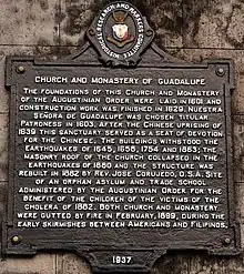 The first sanctuary and monastery in Guadalupe was built by Simón Dantes. This foundation was declared a domus formata or a community under the advocacy of Our Lady of Grace through a Provincial Chapter on March 7, 1601.[2] One year after, the community in Guadalupe was given the right to vote in the provincial chapters.