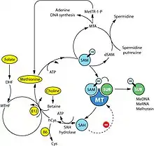 The products of these reactions are methylated DNA, RNA or proteins and S-adenosylhomocysteine (SAH). SAH has a negative feedback on its own production as an inhibitor of methyltransferase enzymes. Therefore, SAM:SAH ratio directly regulates cellular methylation, whereas levels of vitamins B6, B12, folic acid and choline regulates indirectly the methylation state via the methionine metabolism cycle.[98][99] A near ubiquitous feature of cancer is a maladaption of the methionine metabolic pathway in response to genetic or environmental conditions resulting in depletion of SAM and/or SAM-dependent methylation. Whether it is deficiency in enzymes such as methylthioadenosine phosphorylase, methionine-dependency of cancer cells, high levels of polyamine synthesis in cancer, or induction of cancer through a diet deprived of extrinsic methyl donors or enhanced in methylation inhibitors, tumor formation is strongly correlated with a decrease in levels of SAM in mice, rats and humans.[100][101]
