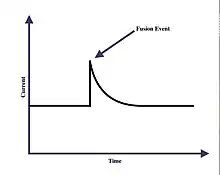 Another electrophysiological measurement that can be made is fusion event duration in a nystatin-ergosterol based system. Fusions are measured while the voltage is held constant, and is characterized by a spike in the current that then returns to the baseline current as the nystatin channels close. When present in smaller concentrations, nystatin momentarily forms pores that allows a vesicle fusion to occur more easily; that fusion then interrupts the pore stability and the nystatin and ergosterol disperse from each other.[32] Conversely, researchers have found that the half-life of these nystatin pores increase with an increased dosage level of nystatin to the membrane systems. This indicates a lower energy of both the lipid membrane and the ionophores when there is a higher concentration of nystatin.[33]