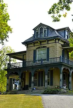 The O.A.E. Blyberg House is a historic building located in Pelican Rapids, Minnesota, United States. Blyberg was a merchant and land speculator who settled here in 1871. He opened the first store in town and served as its first postmaster. His success is exemplified by this 2½-story brick residence that Blyberg had built in 1884 on a large tree-filled lot, and it remains one of the finest houses in town.[2] The Italianate structure features an irregular plan, locally produced cream-colored brick, a low hipped roof with brackets and pendants, a wrap-around porch, and dressed stone window sills. The second story on the back of the house, the balconies on the east and west elevation, a single-story room on the east side, and the pedimented gabled dormers (except for the one on the north elevation) were added in a 1901-1902 renovation. The house was listed on the National Register of Historic Places in 1984.[1]