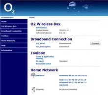 The O2 Wireless Box is a wireless residential gateway router distributed by O2. The latest version is based on the 802.11n standard and also supports 802.11g and 802.11b devices.[1] The device connects to the Internet using either an ADSL2+ or ADSL connection.