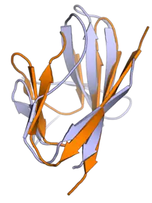 The ORF7a protein is a transmembrane protein with 121 amino acid residues in SARS-CoV-2[5] and 122 in SARS-CoV.[2] It is a type I transmembrane protein with an N-terminal signal peptide, an ectodomain that has an immunoglobulin fold, and a C-terminal endoplasmic reticulum retention signal sequence.[5][6][1] The structure contains seven beta strands which form two beta sheets, arranged in a beta sandwich.[2] Most of the sequence differences between SARS-CoV and SARS-CoV-2 occur in the Ig-like ectodomain and may produce differences in protein-protein interactions.[5]