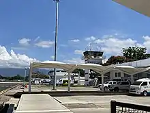 The passenger terminal is a single-story building with a total area of 7,548 square metres (81,250 sq ft). It accommodates both arrivals and departures for domestic and international flights. The departures area features a check-in area, a security checkpoint, and a departure concourse featuring a VIP lounge,[2][3] snack bars, souvenir shops, and eight gates that provide direct access to the apron, allowing passengers to board their planes by walking to the aircraft through a series of open-air walkways. The arrivals section is located at the southern end of the terminal and includes customs and immigration facilities, a baggage claim area, and an arrivals hall with car rental services, taxi stands, snack bars, and souvenir shops.