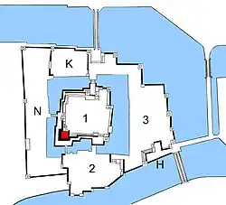 ![]() Layout of Obama Castle - 1: main keep; 2: outer keep; 3: outermost keep; N: eastern keep; K: northern keep; H: main gate; Red: tower. | |