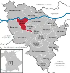 Neighboring communities include Rennertshofen, Burgheim, Ehekirchen, Rohrenfels, Königsmoos and Neuburg an der Donau.