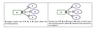 The Event-Condition-Action paradigm provides the OPM operational semantics and flow of control. An event is a point in time at which an object is created (or appears to be created from the system's perspective) or an object enters a specified state. At runtime, this process triggering initiates evaluation of the process precondition. Thus, starting a process execution has two prerequisites: (1) a triggering event, and (2) satisfaction of a precondition.