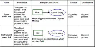 2. Enabling link, which connects an enabler (an object that enables the process occurrence but is not transformed by that process) or its state, to a process, which enables the occurrence of that process.