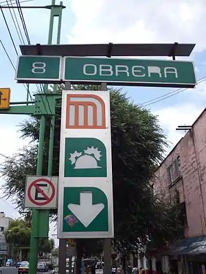 Obrera is a station along Line 8 of the metro of Mexico City.[2][3] The station is situated on Eje Central Lázaro Cárdenas.[2] The station's logo is a construction worker's helmet framed with two gears.[2][3] The name obrera comes from the Colonia Obrera neighborhood where the station is located.[2]