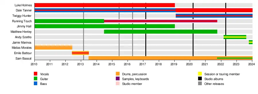 On 3 February 2019, the band released a teaser for their new member in the style of the Tony Hawk's Pro Skater character selection menu.[18] On 4 February 2019, they premiered a new single, 'Ask for the Anthem' and announced the addition of Twiggy Hunter to the lineup as bassist and backing vocalist, with Dale Tanner moving to full-time frontman.[19] On 1 October 2021, the band announced the departure of live guitarist Matt Henley.[20]