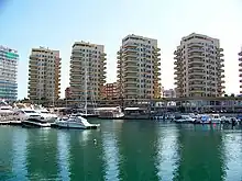 Gibraltar has three marinas: Marina Bay, Ocean Village Marina, and Queensway Quay Marina.[1] Ocean Village Marina is located on Gibraltar's Westside, outside the northern end of Gibraltar Harbour, in the Bay of Gibraltar, next to the airport runway.[2] It is adjacent to Marina Bay which is just to its north.[3] The marina forms part of the Ocean Village Project or Ocean Village Marina Complex, often referred to as just Ocean Village.[4] Ocean Village Marina is the former Sheppard's Marina or Sheppard's Yard.[5] Both Marina Bay and Ocean Village Marina have been incorporated into Ocean Village, between the North Mole and the airport runway.[4][6] The strategic location of the marina offers protection from moisture-laden Levanter winds.[7]